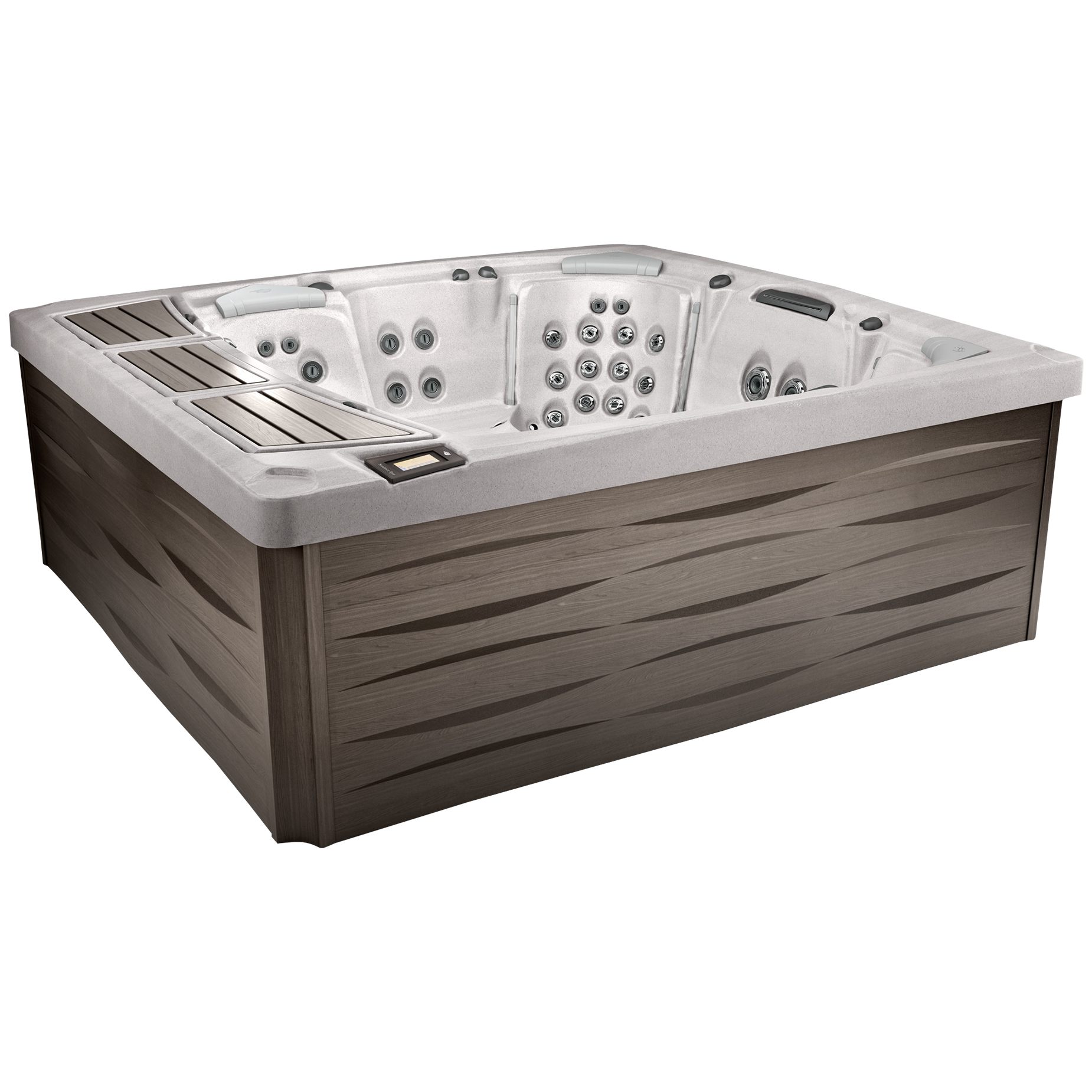 Fall in love instantly with the sleek, rhythmic texture of the outdoor furniture, accented by corner lighting. This eye-catching combination of classic beauty and architectural form is further enhanced by a low-profile flat rail and a stunning lounge deck with illuminated SunCooler cooling areas for added seating and convenience. Throughout the Claremont® 980™ Series Spa, you can melt away stress and tension in seats equipped with popular combinations of our patented Fluidix® Jets. The lounge seat, reminiscent of an easy chair, is shaped to comfortably support your body, so you can sit back and relax without worrying about floating around. As you surrender tired muscles in your neck, back, hips, wrists, legs and feet, an amazing full-body massage provides total relaxation. In the rest of the Claremont® spa, wide seats inspired by some of our most popular models are highlighted by the even glow of LED lighting for both beauty and safety. Silent Air injector jets and SunScents™ Aromatherapy further enhance the incredible experience. Enjoy your spa day and night with a Glass i-Touch Control, equipped with SunSmart® 2.0 Wi-Fi kit, for remote access and to keep you informed of your spa’s status. Maintenance is also a breeze thanks to the tool-less cabinet and advanced MicroClean® Ultra Water Management System.